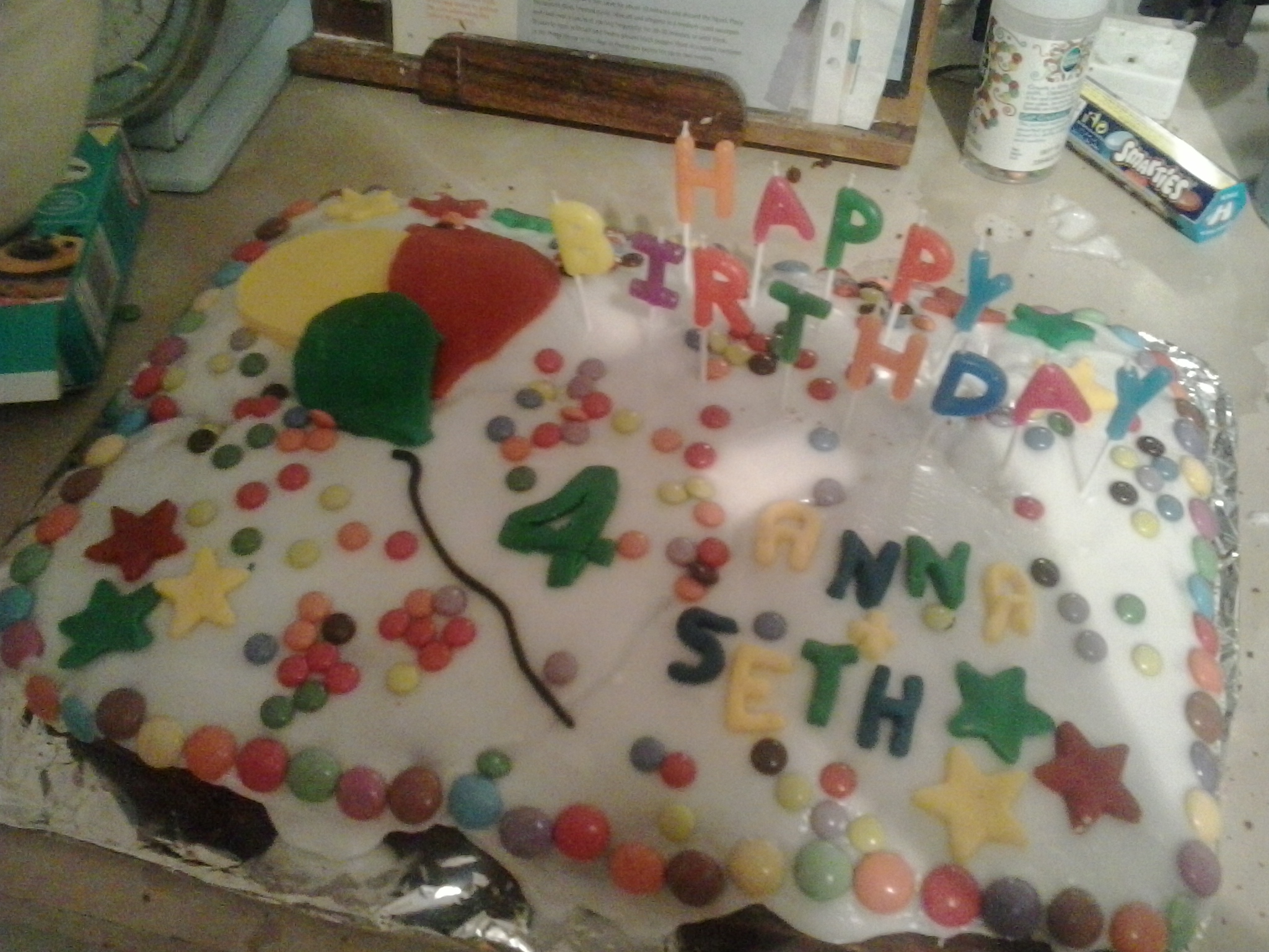 I was semi-hysterical at the thought of icing the cake, but luckily my husband remained completely calm and kept my worst nervous excesses in check. He also made himself very useful cutting out star-shapes, balloon shapes, number 4s, and letters for the birthday boy and girl’s names from coloured icing. I ran amok with a bowl of fondant icing and then several tubes of Smarties, which, combined with the icing cut outs, managed to create a cake which looked reasonably acceptable. Phew. Now it was only the party itself to get through.