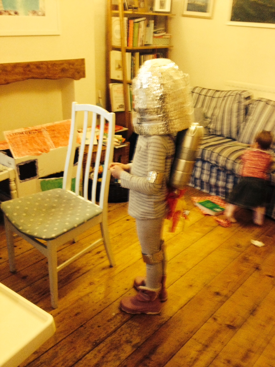 A panicked Facebook plea when Anna announced she needed an astronaut’s costume for school led to my next-door neighbour coming round with the loan of the (amazingly creative) jet-pack he had made for his son’s space party a few months ago. Silvery grey leggings and tshirt, a pudding bowl, a roll of insulating tape, some foil and a bit of swearing and some pink moon boots I picked up on Sell or Swap, and Astronaut Anna was ready for take-off!